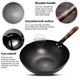 Uncoated wok surface, anti scratch from metal shovel or spatula; Iron as original materil but non rust, durable for using, easy to wash, heat conduct evenly and quickly, save time and energy; Equipped with wooden cover; While supplementing iron, you can enjoy a high quality and healthy life.